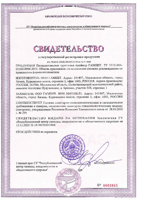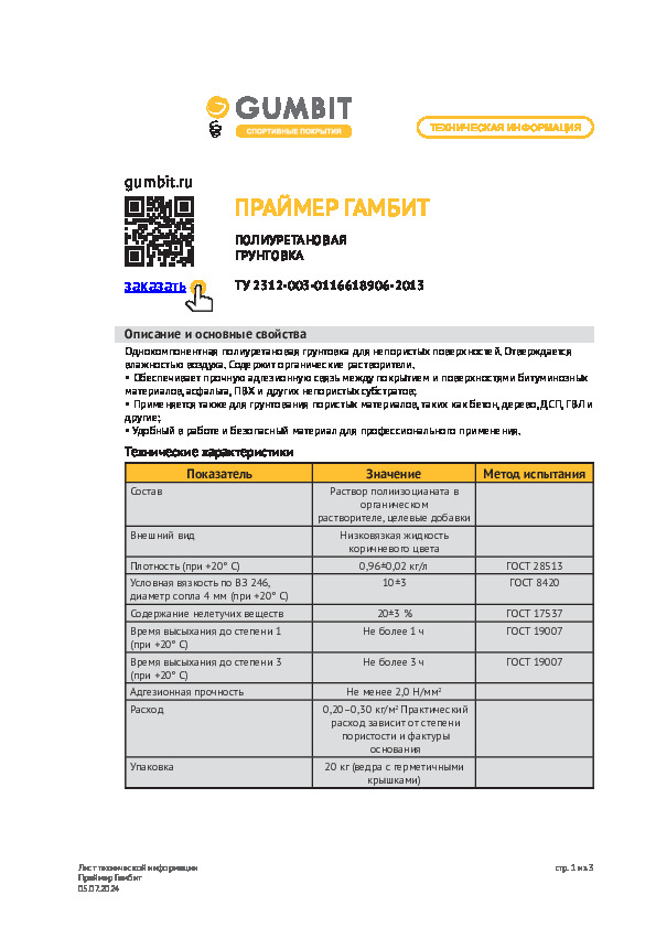 Полиуретановую грунтовку наносят на бетонную или асфальтовую поверхность. Перед началом работ основание обязательно очищают от масляных и жирных пятен, шлифуют крошащиеся участки, удаляют пыль и мусор. Универсальную грунтовку «Праймер Гамбит» наносят в один слой без пропусков. Можно использовать кисти, валики, оборудование безвоздушного распыления. Праймер высыхает до 1 степени через час после нанесения, а до 3 степени — через 3 часа. Низкие температуры и высокая влажность замедляют процесс высыхания.